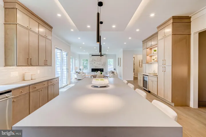 The luxury kitchen exudes refined elegance, featuring floor-to-ceiling custom cabinetry, an oversized island, and soft under-cabinet lighting that sets a moody, sophisticated tone. A sleek wet bar adds an element of effortless entertaining, while the adjacent butler’s pantry provides additional function with elevated style.