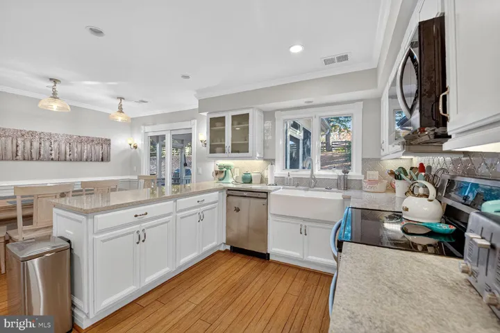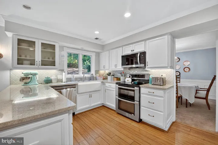 The entrance of this Countryside home leads to a large Foyer which provides a warm welcome to visitors. The Formal Living room provides an elegant space for guest reception and relaxation time. A traditional Dining Room with wainscotting connects to the Kitchen through a framed-glass door.