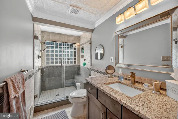 Two more Bedrooms maintain proper proportions while providing more-than-sufficient closet storage. One has newly-installed pine flooring. Yet another bedroom functions well as a nursery, guest room or a second home office. The Hall Bathroom is nicely appointed with a granite counter top, tasteful tiles, and a step-in shower.