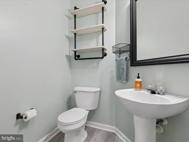 The main level flows into an open concept living and dining area, featuring a modern kitchen with island, and luxury vinyl plank flooring. Half bath on the main level. Three level bump out adds a breakfast room and additional square footage. Direct access to a deck and views backing to trees.