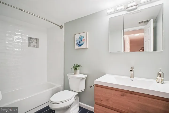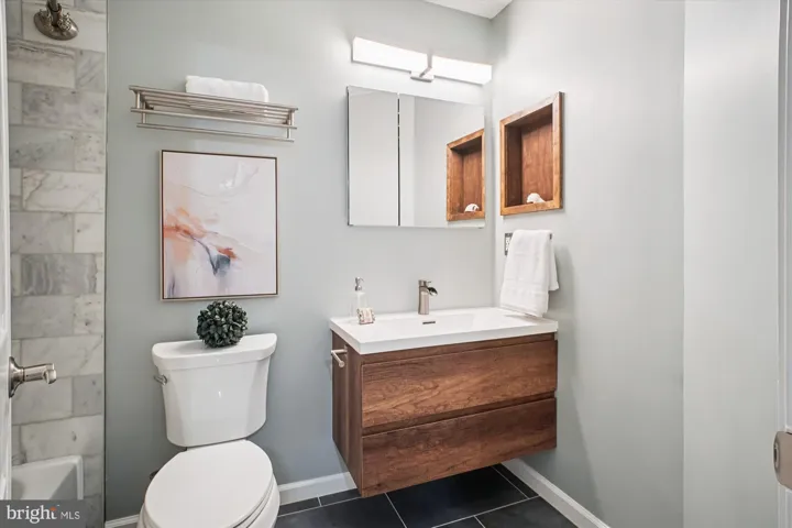 As you retreat for the night, make your way up the steps with plush Berber carpet to the second level. Here you will find the Sun-lit freshly painted primary bedroom, with cathedral ceiling, chair rail molding, ceiling fan, and large walk-in closet with access to attic storage. Enjoy the en-suite fully renovated primary bathroom designed with a floating dual vanity with modern fixtures, tile floors, custom built in, and beautiful stand-up shower. As you make your way through the rest of the second floor, you will find a second fully renovated bathroom decked out with a floating vanity, custom built in, and gorgeous marble tile. Two additional bedrooms close out the second level with large closets and ceiling fans.