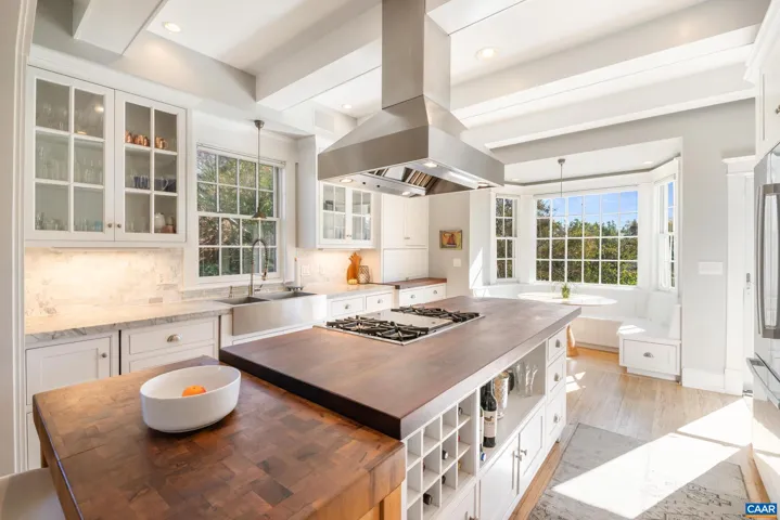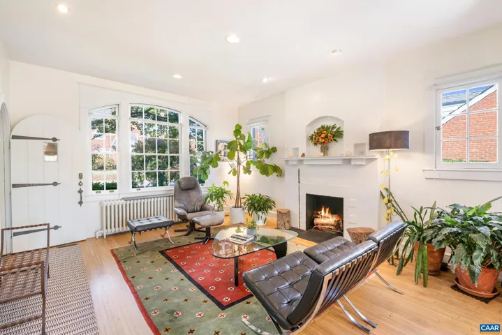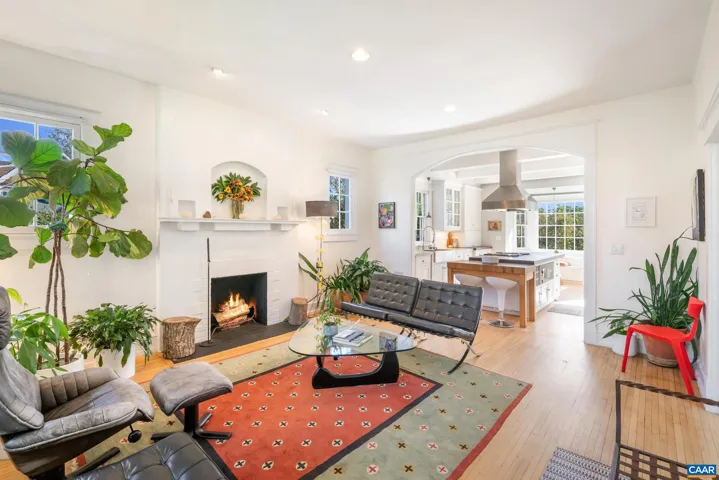 OPEN SUNDAY, 10/26, 2?5 PM! Open your next chapter in this storybook c. 1930 cottage perfectly situated on dogwood-lined Evergreen Ave-one of North Downtown?s most beloved streets, along the 10-Miler route. A rare offering that blends timeless character w/ exquisite updates, this home delights at every turn. The inviting covered front porch and arched entry lead to a JEWEL BOX INTERIOR bathed in light streaming through architectural windows, 9.5′ ceilings, handsome built-ins and white oak + southern yellow pine floors. The Karen Turner-designed kitchen is a SHOWSTOPPER, featuring Carrara marble counters, black walnut island, custom cabinetry, Bosch/Wolf appliances, built-in pantry + appliance storage + coffee bar. Sunny breakfast nook overlooks a peaceful backyard with IPE decking and built-in planters. MAIN LEVEL LIVING possible with 1st floor bedrooms and full bath. Upstairs offers a 3rd bedroom, 1/2 bath and flex space. Recent upgrades-NEW HVAC (2023), NEW metal roof (2021) + 2 EV chargers. Potential for fabulous carriage house/studio in detached 2 car garage w/ electric panel + water/sewer access. An ENTERTAINER’S DREAM and idyllic retreat just steps from the Downtown Mall, boutique shopping, fine dining and farmer’s markets.,Glass Front Cabinets,Marble Counter,White Cabinets,Wood Cabinets,Wood Counter,Fireplace in Living Room