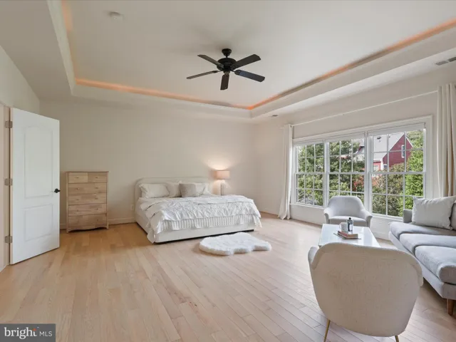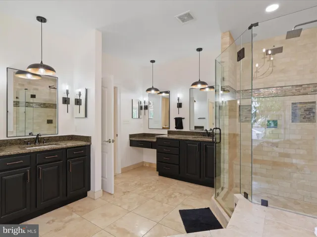 The primary suite is a lavish sanctuary. It features newly installed white oak hardwood floors, boasts double walk-in closets, a dedicated vanity room, and a spa-like bath equipped with Italian travertine, a dual shower, a separate soaking tub, and a private powder room.