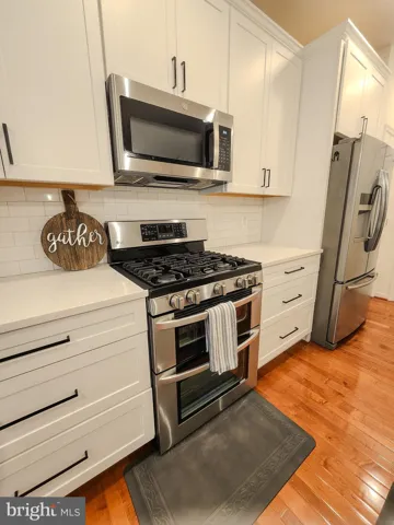 Step inside to find gleaming hardwood floors throughout, elegant crown and wall moldings, and a gas fireplace. The gourmet kitchen is a chef’s dream, fully remodeled in 2022 with modern 42″ white cabinets, sleek quartz countertops, stainless steel appliances (new dishwasher & microwave in 2024), recessed lighting, and two expanded pantries. The open-concept living area, featuring a cozy gas fireplace and custom moldings, is perfect for both relaxing and entertaining.