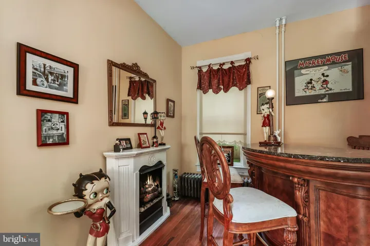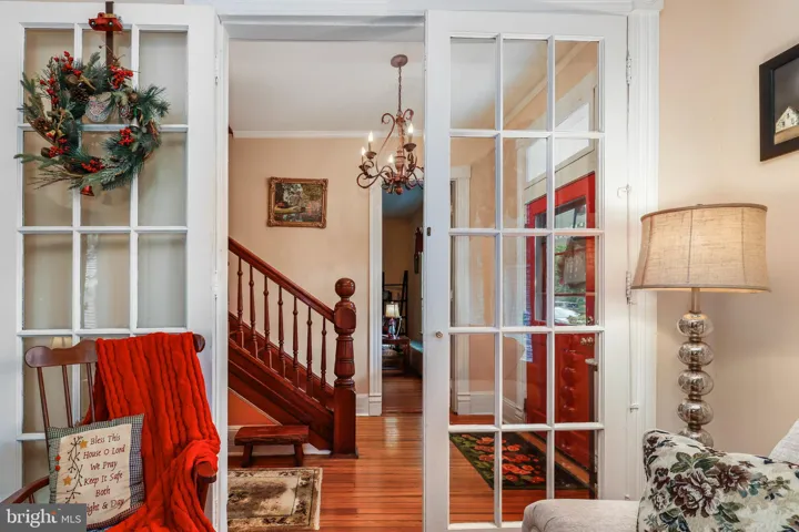 The home boasts two expansive levels, both featuring impressive 12-foot ceilings that soar from the Center Hall staircase and foyer. To the right of the open entry, a charming living room/parlor offers a freestanding retro gas stove for cozy fires and a bonus pub area. Opposite the parlor, glass-panel French doors open into another beautifully lit living room, perfect for a home office or library, leading into a spacious dining room.