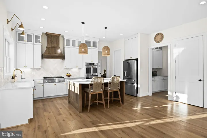 A warm brick gas fireplace anchors the spacious great room, while the gourmet kitchen impresses with Thermador gas range top, GE Café refrigerator and double wall ovens, soft-close cabinetry, and 42” upper cabinets with additional storage above.