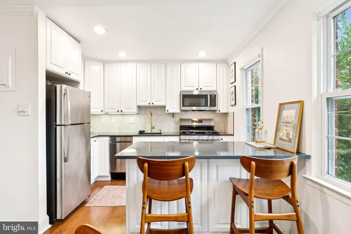Step inside to a bright, open layout featuring oversized windows and brand-new hardwood floors throughout. The updated kitchen is designed for both function and style with quartz countertops, a modern backsplash, white cabinetry, a center island with seating for two, and stainless steel appliances.