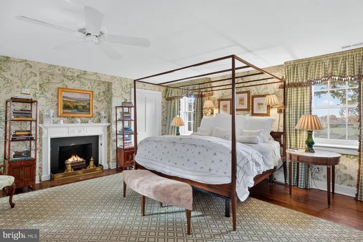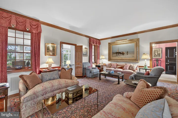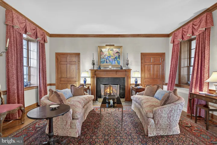 Set on 175 acres of conserved land with panoramic views of the Bull Run and Blue Ridge Mountains, Seven Springs is a historic country estate that offers natural beauty, timeless architecture, and refined rural living. Anchored by a gracefully expanded and updated circa 1790 stone residence and complemented by a spacious guest house, the property is framed by rolling fields, stone walls, mature woodlands, a spring-fed stocked pond, and a breathtaking formal garden area, creating an exceptional retreat for everyday enjoyment that lends itself to endless entertaining possibilities. The main house marries early American craftsmanship with thoughtful modern updates. A welcoming foyer is flanked by a library and a formal living room, each featuring a wood-burning fireplace and preserved original pine floors. From the living room, access both the formal dining room, with it’s own fireplace, and adjacent sunroom, with garden and patio access.