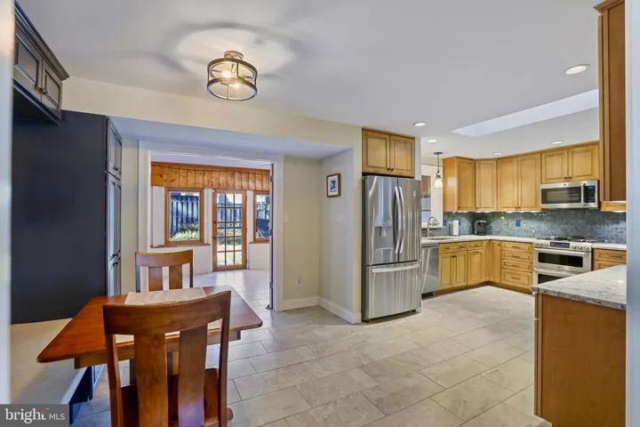 The inviting living room boasts a large bay window with custom draperies, while the updated kitchen shines with a skylight, elegant cabinetry, ample storage, granite countertops, and stainless steel appliances—including a gas range with a double oven.