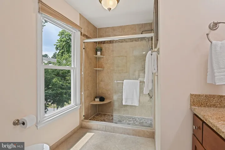 Upstairs, the light-filled owner’s suite offers dual walk-in closets with custom shelving, and a private office—ideal for today’s work-from-home lifestyle. The en-suite bath features a glass-enclosed shower and sleek single-sink vanity. Three additional generous bedrooms, each with deep closets, share a beautifully updated hall bath with a double-sink vanity, tub/shower combo, and linen storage.