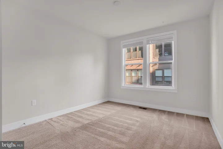 The main level showcases wide-plank hardwood floors and soaring 9-foot ceilings. Floor-to-ceiling windows in the open living and dining area fill the space with natural light. The kitchen features quartz countertops, a stylish tile backsplash, Whirlpool stainless steel appliances including gas cooking, and 42” cabinets for abundant storage. A pantry, coat closets, and a powder room add convenience, while the attached one-car garage provides easy access.