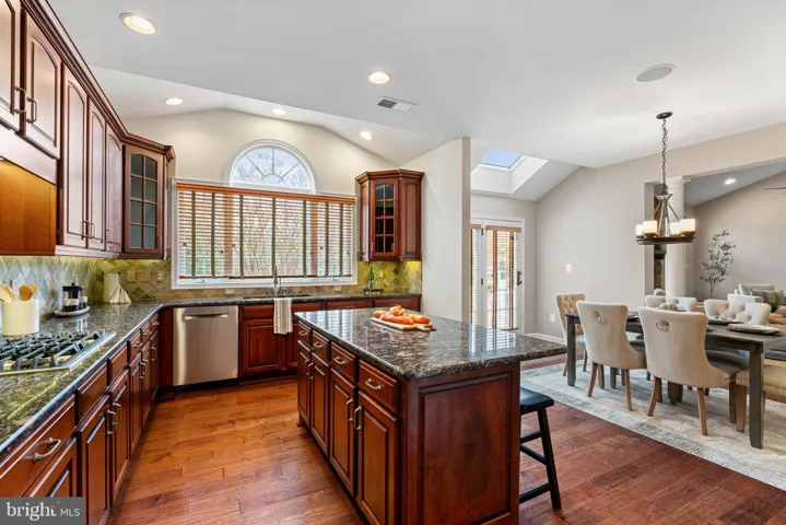 The gourmet kitchen is a chef’s dream—featuring a large center island, gas cooking, stylish backsplash, updated countertops, stainless steel appliances, and a generous pantry. The oversized window with a Palladian arch floods the space with natural light and provides serene views of the treed backyard. Enjoy casual meals in the sunny breakfast area with a large skylight that opens to the warm and welcoming oversized family room, complete with a stunning stone fireplace.