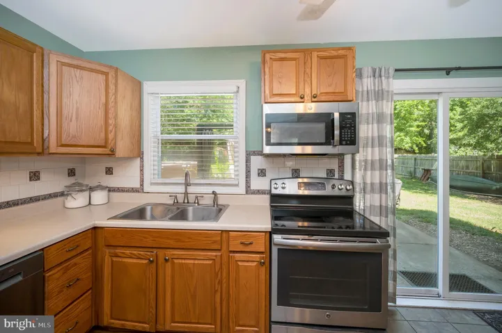 The main level boasts an open-concept kitchen and living space designed for everyday living and entertaining. The kitchen is equipped with stainless steel appliances, an island, ample cabinetry, ceramic tile flooring, and a custom built-in desk that makes working from home a breeze. Sliding glass doors provide abundant natural light and seamless access to the backyard. Just off the kitchen, the inviting family room features updated LVP floors, a cozy wood-burning fireplace, and an additional set of sliding glass doors to the yard—perfect for summer barbecues or quiet evenings by the fire. A convenient half bath completes the main floor.