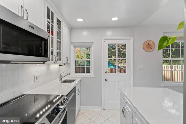 The main level boasts bright hardwood floors, a remodeled kitchen with new quartz countertops, backsplash, and breakfast bar, plus brand-new Samsung and Bosch appliances — refrigerator, induction range, microwave, and Bosch 800 dishwasher — all covered by protection plans. A new door from kitchen to basement (2025) adds convenience and flow.