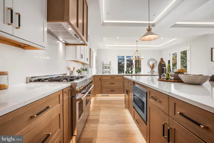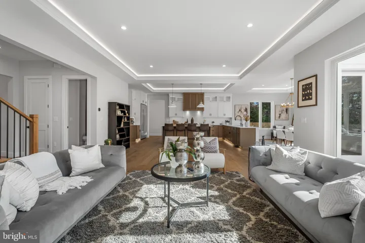 The main level boasts an expansive family room with tray ceilings and LED lighting, gas fireplace and it opens to a gourmet chef’s dream kitchen, complete with a oversized quartz island, luxury top-of-the-line stainless steel Jenn-Air appliances, under cabinet and floor lights, butlers pantry and a walk-in pantry. Entertain in the elegant formal dining room, complemented by a versatile office or guest suite with a full bath. The bright breakfast area flows effortlessly into the family room and out to the deck, creating the perfect setting for indoor-outdoor gatherings. A stylish mudroom and a doggie spa bath center—accessible from both the kitchen and the garage—enhance the home’s thoughtful design.