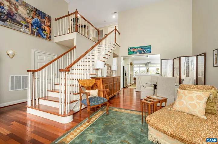 One-level living in the highly sought-after Kenridge community offers a maintenance-free lifestyle in an ideal location. The elegant and open floor plan is flooded with natural light, featuring soaring ceilings and beautiful cherry inlaid hardwood floors, a slate roof. An expansive gourmet kitchen is equipped with a quartz island, breakfast counter, and a custom-designed bar, adjacent to a bright sunroom. A deck and brick patio, perfect for entertaining, extend just off the sunroom. The main level owner’s suite serves as a private oasis, boasting a spa-like bath, an en suite half bath, and two walk-in closets. Additionally, the laundry room is equipped with cabinets and a full-size sink, complemented by a hallway half bath that completes the first level.The versatile upper level features a loft, two bedrooms, a full bath, and a private office. The finished terrace level provides excellent entertainment spaces, including a complete wet bar, a billiards table area, a bonus room currently used as a guest bedroom, a full bath, and plenty of storage. HOA covers trash, recycling, snow removal, and landscaping. Built-in lawn sprinkler system and a whole-house central vacuum system. Conveniently located just minutes to town, golf, UVA.,Cherry Cabinets,Quartz Counter