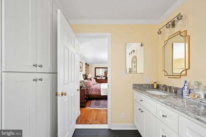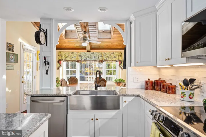 Upon entering the foyer, a private study (currently used as an office) with ample built-in bookshelves is to your right. To your left, you’ll find a formal living room with floor-to-ceiling windows and stunning moldings. The family room offers a sense of peace and warmth, with amazing, colorful views of the rear yard. The kitchen features a perfect table space in front of a large picture window and is open to the recently renovated kitchen. Through classic arches, you’ll discover a window-filled sunroom with a single French door leading to a spacious deck overlooking a stunning rear yard, positioned just above a stamped concrete patio.