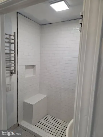 The kitchen is a true standout featuring new custom cabinetry, granite countertops, and stainless steel appliances, including a dishwasher, microwave, and in-unit washer and dryer. The bathroom feels spa-like with a custom walk-in tile shower with built-in bench, a heated towel rack, and a commercial-grade pressure-assisted toilet.