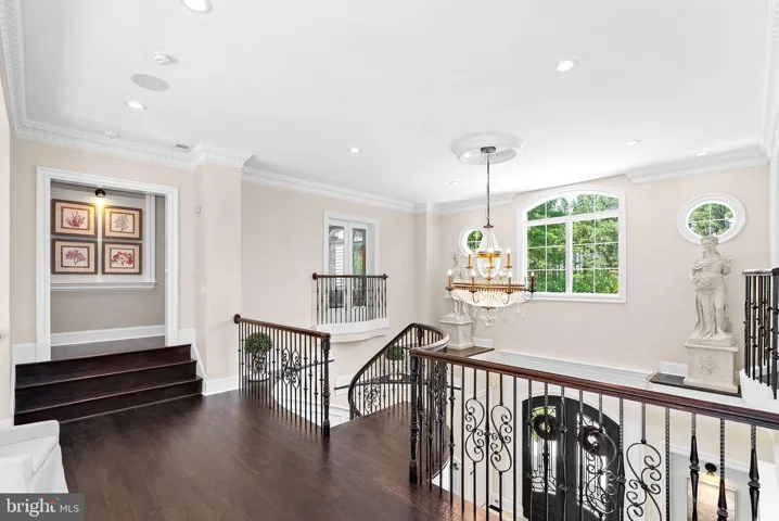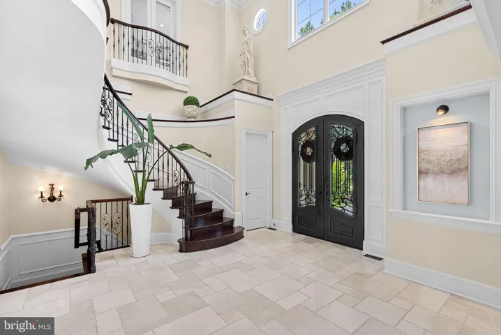 As you arrive, a circular driveway flanked by monuments and large coach lights welcomes you. The grand entrance is adorned with front iron gate doors, leading to a two-story foyer with 25-foot ceilings and a floating solid wood staircase with iron spindles. The interior showcases chiseled travertine edge flooring, 8-inch reclaimed hardwoods, and detailed moldings throughout.
