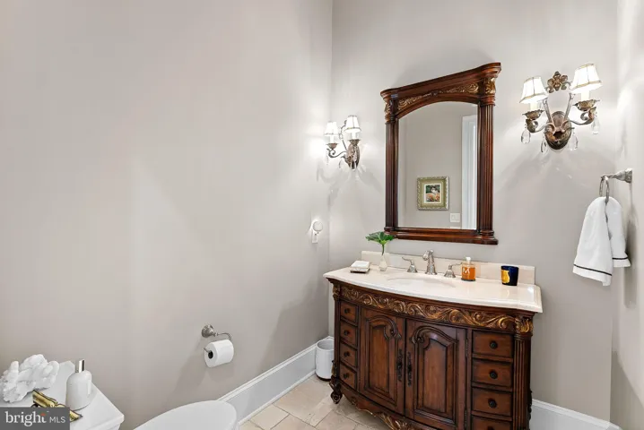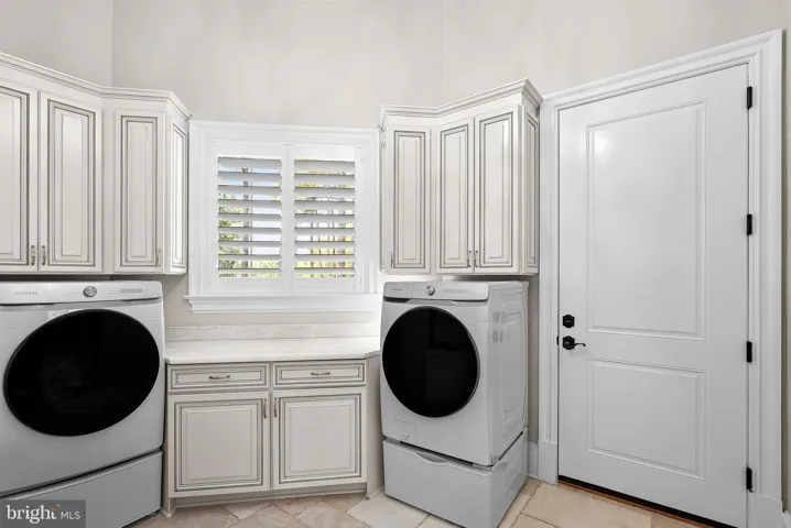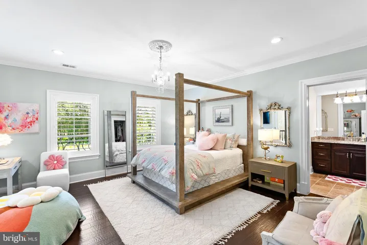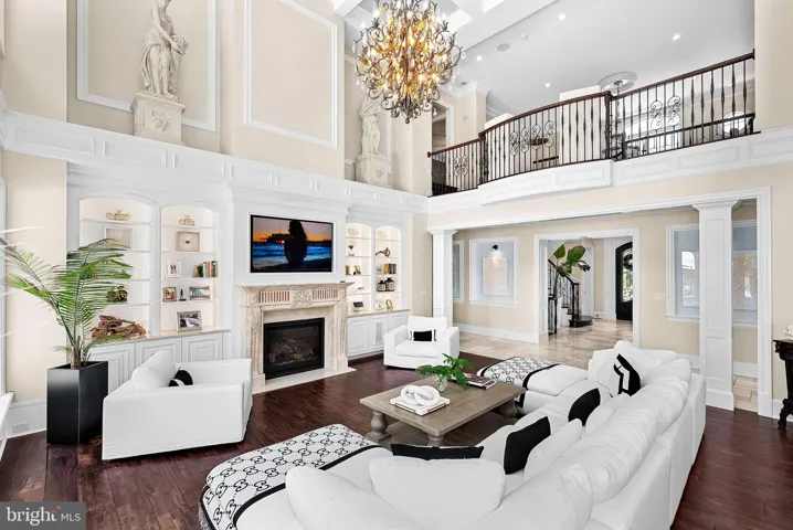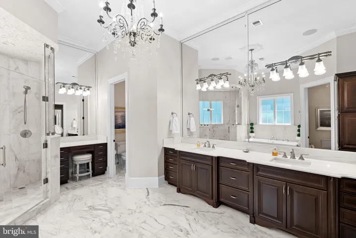 This estate features five bedrooms, each with en-suite marble or travertine bathrooms, and a primary suite on the main level boasting 16 foot ceilings, dual chandeliers, and floor-to-ceiling marble surround fireplace with a 7-foot mantle. The opulent primary bathroom features Calcutta marble floors, two water closets, a double sink vanity with a separate make-up area, soaking air jet bubble tub, spacious dual seamless glass walk-in shower, and a stunning John Richards chandelier.