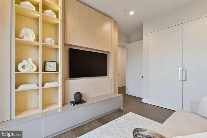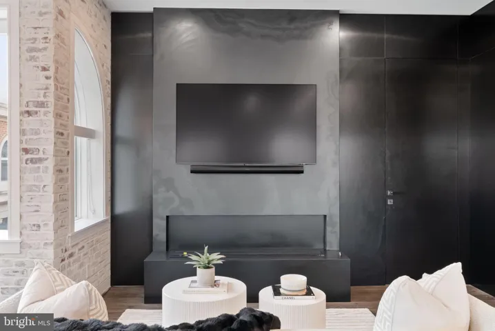 Every room features custom millwork, concealed storage, artistic accent walls, and integrated lighting. The open-concept kitchen showcases an Italian quartz waterfall island and a full JennAir appliance suite. The living area is anchored by an imported Italian onyx porcelain feature wall with ambient, customizable lighting and a water-vapor art display — a striking focal point that defines the space.