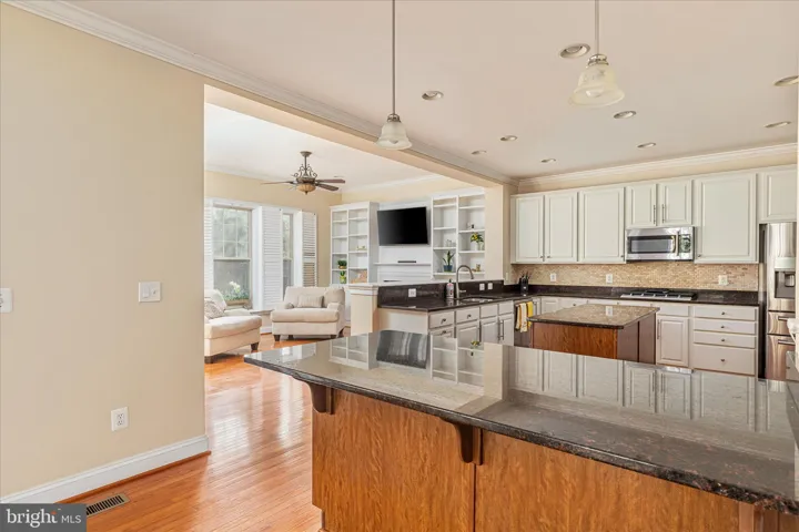 Step inside to a beautifully appointed main level featuring rich hardwood flooring, custom built-ins, and a bright, open layout that flows seamlessly from room to room. The gourmet kitchen is the heart of the home, complete with granite countertops, stainless steel appliances, double ovens, and ample cabinetry—perfect for both everyday meals and entertaining large groups.