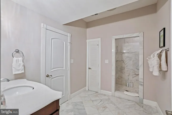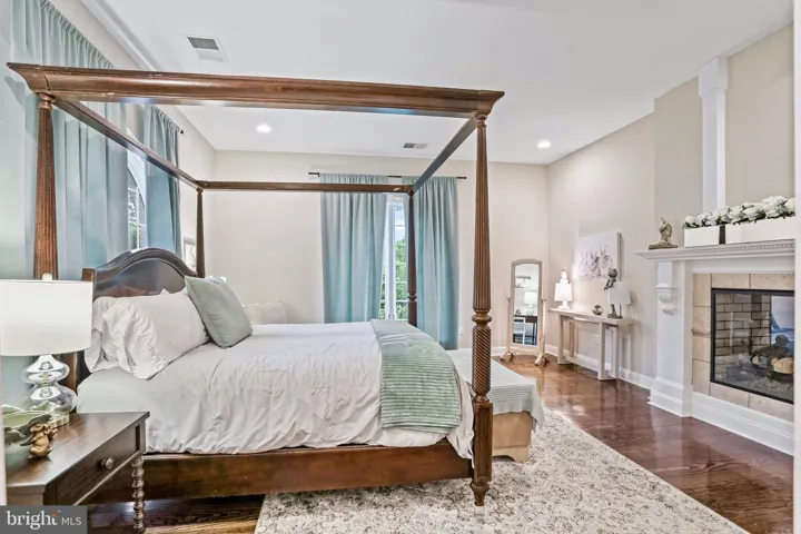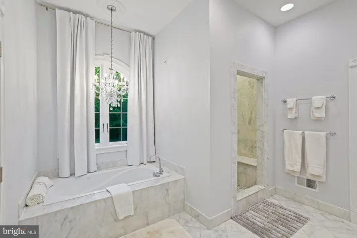 The main level welcomes you with sun-filled spaces, refinished hardwood floors (2024), and a layout designed for both everyday living and elegant entertaining. At the heart of the home, the kitchen is a true chef’s dream—anchored by a commercial-grade GE Monogram range beneath a striking arched stone hearth. A quartz island installed in 2024, Sub-Zero fridge/freezer, stainless steel backsplash, and KraftMaid cabinetry complete the space. A formal dining room sits just off the kitchen, while the expansive family room opens through double French doors to the rear deck and wooded views beyond. The main-level primary suite is a private retreat with a double-sided fireplace, walk-in closet with its own gas washer and dryer, and a spa-inspired bath with dual vanities, a jetted soaking tub, and separate tiled shower. A stylishly remodeled powder room rounds out this level.