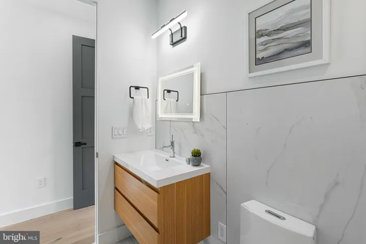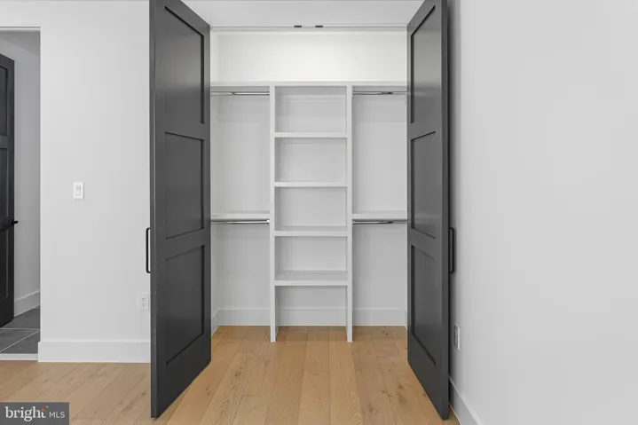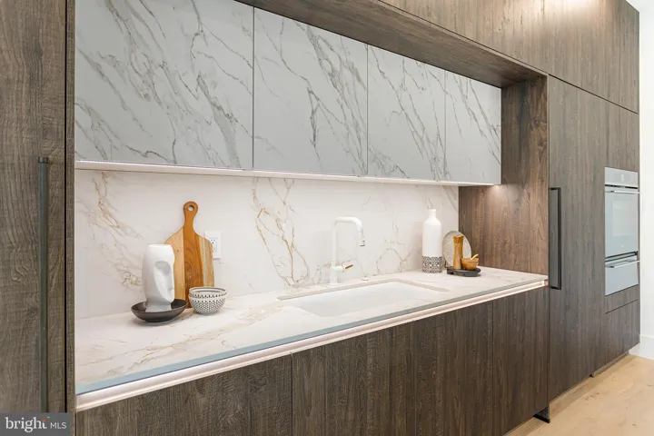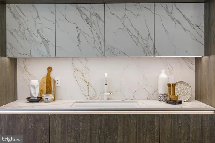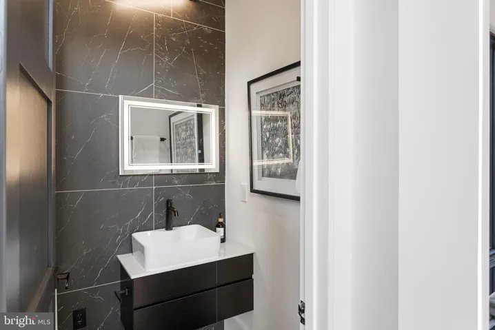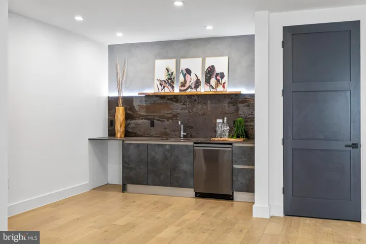 Upstairs, the primary suite is a private sanctuary with a Juliette balcony, sitting lounge, custom dressing room, and a spa-like bath that feels like a boutique retreat — a freestanding tub, a glass wet room, and masterful tilework. Two additional en suite bedrooms, a built-in bar, and a 530-square-foot rooftop deck complete the upper level — an entertainer’s dream in the sky.