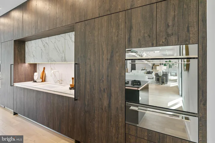 Inside, light becomes art. Walls of aluminum-clad glass, 10+ foot ceilings, and white oak floors create a rhythm of openness and air. The two-story great room anchors the home — dramatic yet warm — with a floating staircase that seems to hover midair. At the center, a chef’s kitchen designed for both precision and performance: Bauformat cabinetry from Germany, Dekton stone surfaces, and an oversized island framed by top-tier European appliances — Liebherr, Smeg, Pitt.
