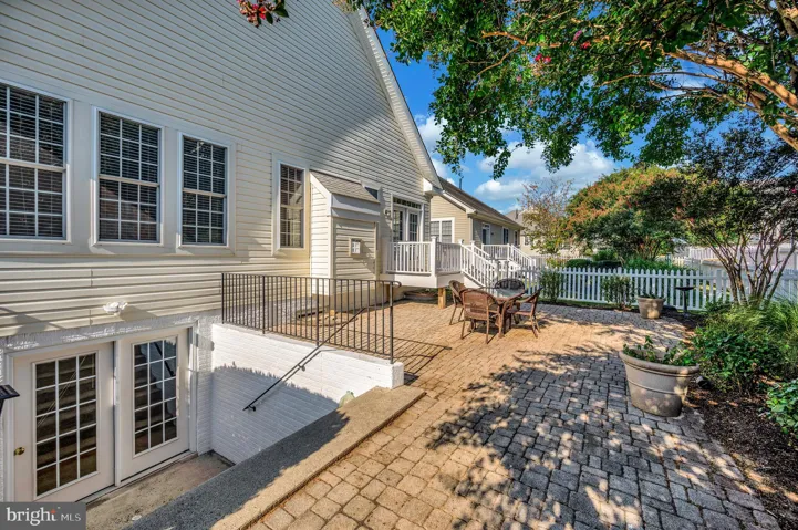The vaulted family room with gas fireplace flows into a light-filled dining area, accented by French doors leading to a peaceful deck, paved patio, and mature landscaping—perfect for entertaining. The well-appointed kitchen offers granite countertops, stainless appliances, ample storage, and a cozy breakfast area. A convenient main-level laundry room completes the floor.