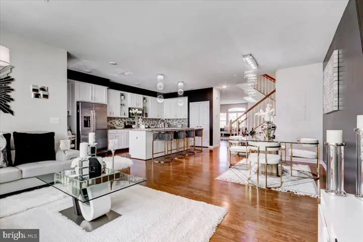 Highlights include a gourmet kitchen with granite countertops, double wall ovens, gas range, stainless steel appliances, upgraded white cabinetry, and improved lighting in the kitchen/dining area. Additional upgrades include enhanced railings, upgraded hardwood flooring on the upper level, and a fully finished garage.