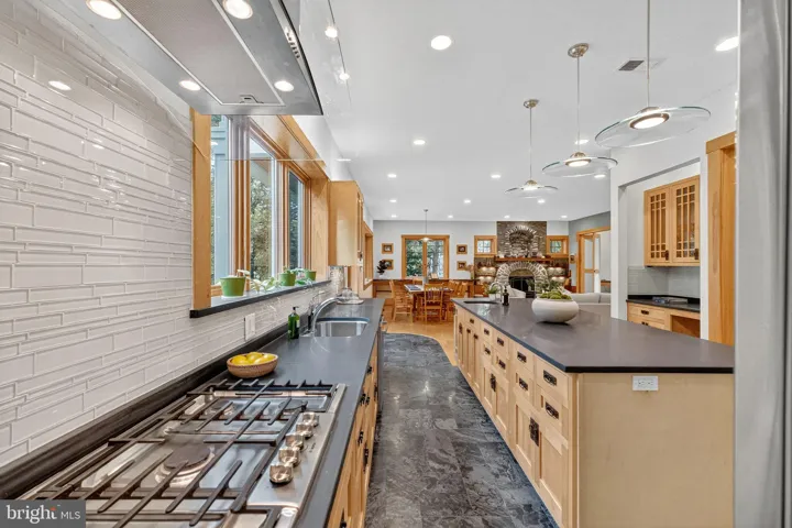 Flooded with natural light from oversized windows, 10ft ceilings on the main floor create expansive and inviting spaces, while warm wood accents and artisanal stonework impart traditional Craftsman charm. The open-concept floorplan is perfect for relaxing or entertaining, allowing family, friends, and guests to simultaneously enjoy the grand stone fireplace and gourmet kitchen, complete with custom maple cabinetry, onyx soapstone countertops, and top-tier Energy Star and Bosch appliances. French doors open onto an expansive backyard patio with an outdoor kitchen and grill surrounded by an organic garden, offering additional entertainment possibilities on warm evenings.