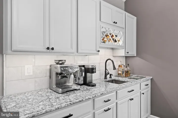 matching copper hood over the range, pot filler, custom tile backsplash, wine & coffee bar, and