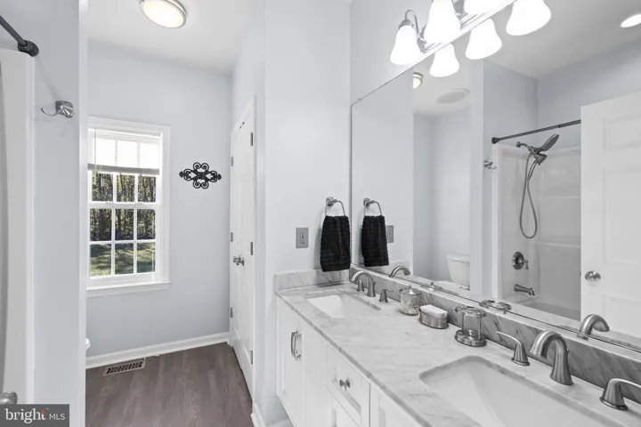 while the rear bedroom has hardwood flooring. Both served by a guest bath with dual marble