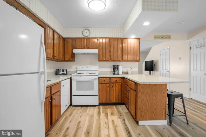 Updated contemporary townhome in the desirable East Winds community on Chincoteague Island. This bright, move-in-ready home offers a spacious living room with a corner fireplace and new luxury vinyl plank flooring throughout the first floor. Continue into the updated kitchen featuring new countertops, new appliances, a peninsula eating bar, and an adjoining dining area. Sliding glass doors open to the rear deck overlooking a fenced backyard. A convenient half bath and laundry complete the main level.