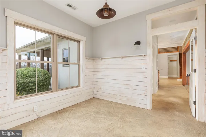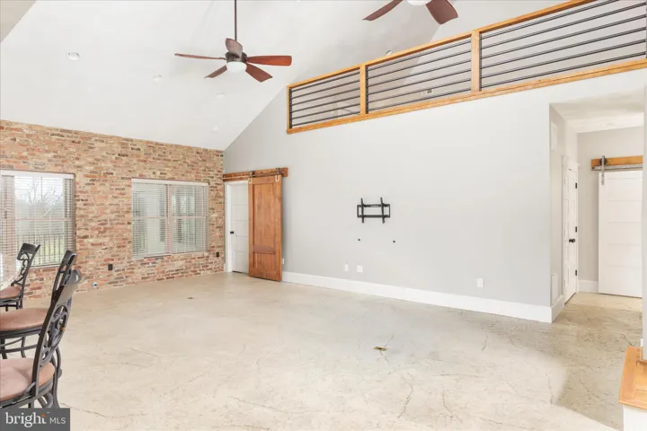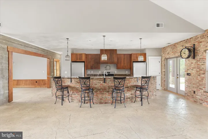 Step inside to an inviting open layout highlighted by stamped concrete floors and a striking concrete accent wall surrounding the dining area. The gourmet kitchen is truly the heart of the home, featuring a reclaimed brick island, upgraded cabinetry, granite countertops, and a stand-alone refrigerator and freezer on opposite ends for convenience. The reclaimed brick continues into the living room, complemented by vaulted ceilings for a spacious, warm feel.