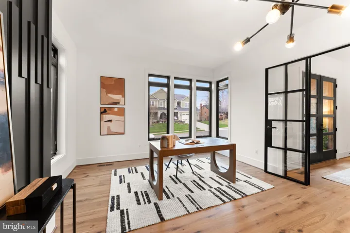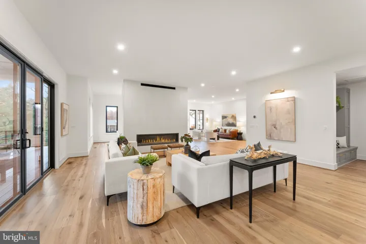 Beyond the grand double doors of the foyer, the study sits to the right behind striking steel-and-glass doors, setting a sophisticated tone for the home’s craftsmanship and design. The main level unfolds with custom millwork, curated lighting, and an expansive Family Room anchored by an oversized linear fireplace, creating a warm and welcoming place to gather.