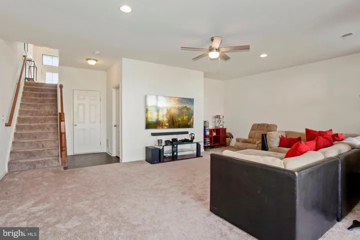 Spacious and fresh townhome in Embrey Mill, north Stafford! 10ft bump-out on all three levels. Handy to all of the exceptional Embrey Mills amenities. 9ft ceilings, hardwood and carpeted flooring, recessed lighting, and beautiful windows to let in natural light. The kitchen has a large kitchen island and plenty of room for entertaining with gourmet double oven range, tons of counter space and energy-efficient SS appliances. Custom breakfast nook bump-out offers an abundance of natural sunlight. The master bedroom is oversized with a spacious sitting room. The large master bath includes separate vanities with walk-in closet. The basement also boasts 9ft ceilings with walkout patio access, includes an unfinished bathroom ready for your imagination, all rough-in work completed. The rear deck and patio area are perfect for entertaining. Fenced in back yard with 6 ft vinyl privacy fence. VA assumable loan at 2.3%! Call today for details!