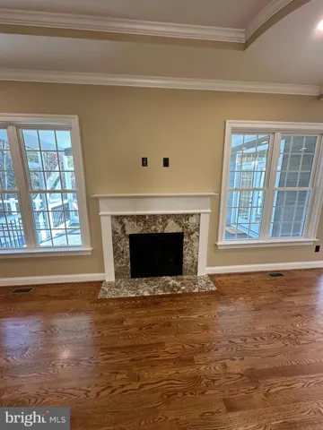 Exquisite Main Level: Rich, stained Early American hardwood flooring flows seamlessly across the entire main level, excluding the elegant tiled bathrooms and laundry room, creating a warm, inviting atmosphere.