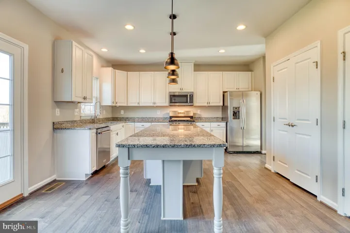 The heart of the home is the spacious eat-in country kitchen, featuring granite countertops, stainless steel appliances, abundant cabinetry, a pantry, and a large island with seating—perfect for everyday living and entertaining. A separate dining room adds flexibility for formal gatherings, while the light-filled living room offers a cozy stone gas fireplace. A main-level den provides the ideal space for a home office or playroom.